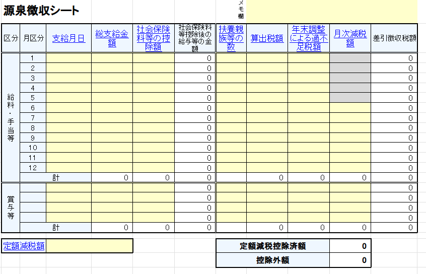 12か月分の給与を「年末調整計算シート」に反映し、年末調整を完了してください。「源泉徴収シート」タブも必ず正確に完成させてください。