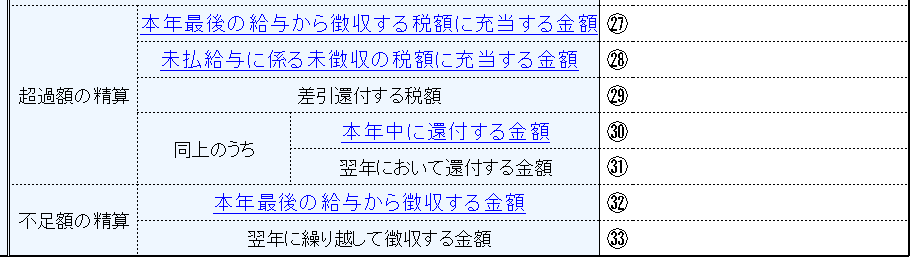• 上記の「超過額の精算」(従業員・役員に対して還付となる場合)「不足額の精算」(従業員・役員から追加で源泉徴収が必要となる場合)欄が、年末調整の結果です。