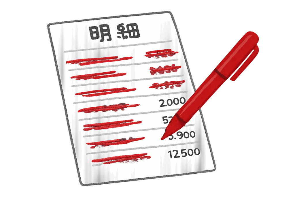 「銀行口座の入出金明細」や「クレジットカード利用明細」などを1行ずつ消し込んでゆく形で必要な資料を収集してゆくと、二度手間となるリスクを軽減できます。